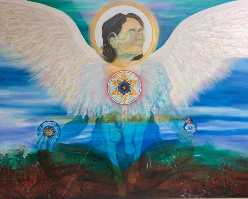 RECONCILIATION OF BUTTERFLY WOMAN • 36" x 48" • Acrylic, Silk paint, Collage on Canvas • SOLD