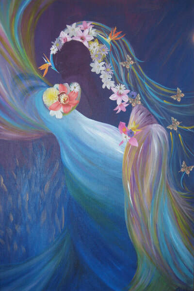 I created this painting for Helen Grenon. She desired to bring in her future partner and commissioned me to paint it into fruition. I asked for a list of her desires. I printed it out, attached it to the back of the painting. Just before I started the painting, a song on my iTunes kept repeating itself. The song was entitled "Make You Feel My Love" by Adele. I hadn't realized it until I began painting it was her mate coming through and the words to the song was how his energy was connecting.